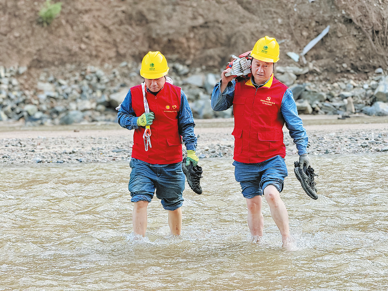 △國網(wǎng)商洛供電公司共產(chǎn)黨員突擊隊(duì)隊(duì)員徒步巡視水毀線路設(shè)備