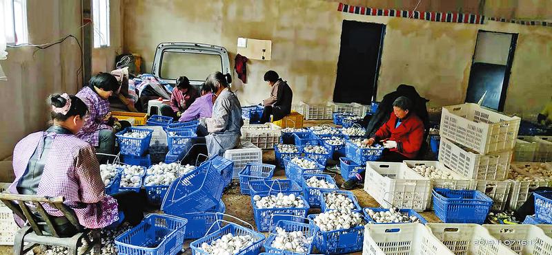 群眾將雙孢菇分類(lèi)整理,進(jìn)行包裝。