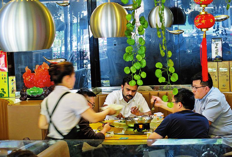 梅曉靜和丈夫田宏新開的酸菜魚土菜館,經常有外賓光顧。(5月3日攝)