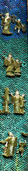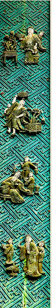 戲樓中額懸“秦鏡樓”立匾,正面主額橫匾題書“和聲鳴盛”,左右為一副木雕組畫楹聯(lián)。此木雕組畫楹聯(lián),遠(yuǎn)觀似8個字,近看是8幅畫。據(jù)《丹鳳縣志》記載:“‘和聲鳴盛’巨匾兩側(cè)有組畫拼成楹聯(lián)一副,然惜今已無人破譯。”這8幅畫組成的楹聯(lián)究竟是什么內(nèi)容?上百年來無人能解聯(lián)。有人曾將此聯(lián)拍攝放大,送到權(quán)威機(jī)構(gòu),請專家、教授研究破譯,至今無果。
