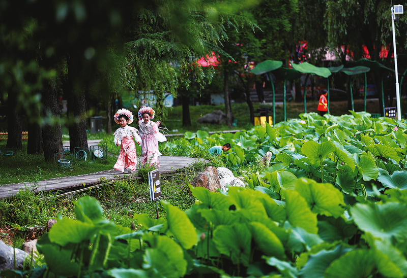 孩童在荷塘邊嬉戲