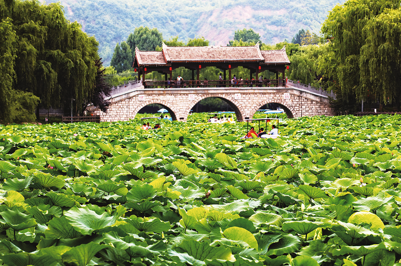 風(fēng)雨橋下荷葉涌動(dòng),游人橋上橋下穿梭其中。