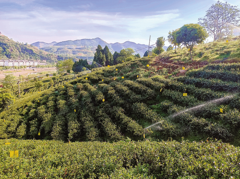 茶園2022年安裝了先進的自動化噴灌系統(tǒng),建成“山腳引水—山腰蓄水池—山頂調(diào)節(jié)池”三級提水系統(tǒng),鋪設9公里管網(wǎng),安裝2套智能加壓設備,利用抽水蓄能引流銀花河水進行灌溉。山腳泵站將水抽至300米高的蓄水池后,依托地勢落差形成自然水壓,精準輸送至每片茶園,不僅有效緩解了高溫天氣對茶葉的影響,還實現(xiàn)了來年茶葉的穩(wěn)產(chǎn)增產(chǎn)。
