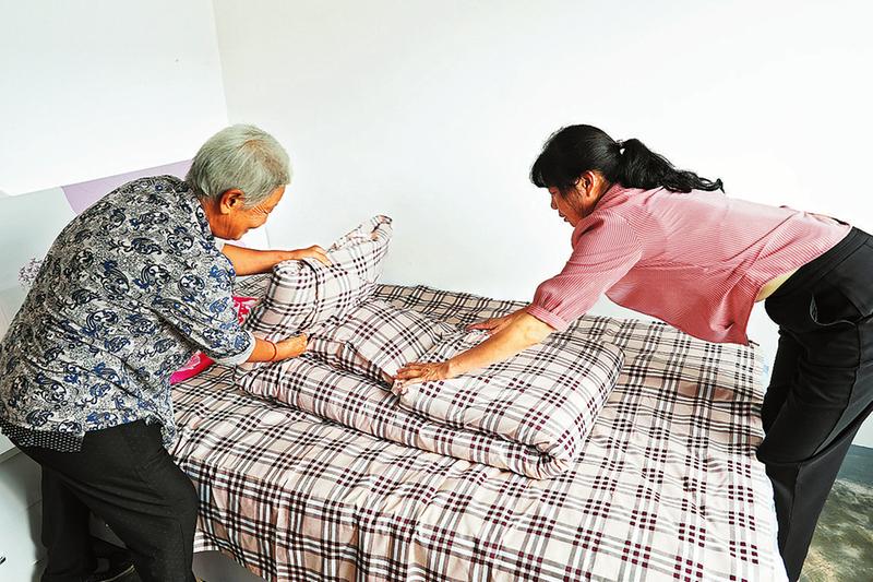 管理人員幫老人整理房間