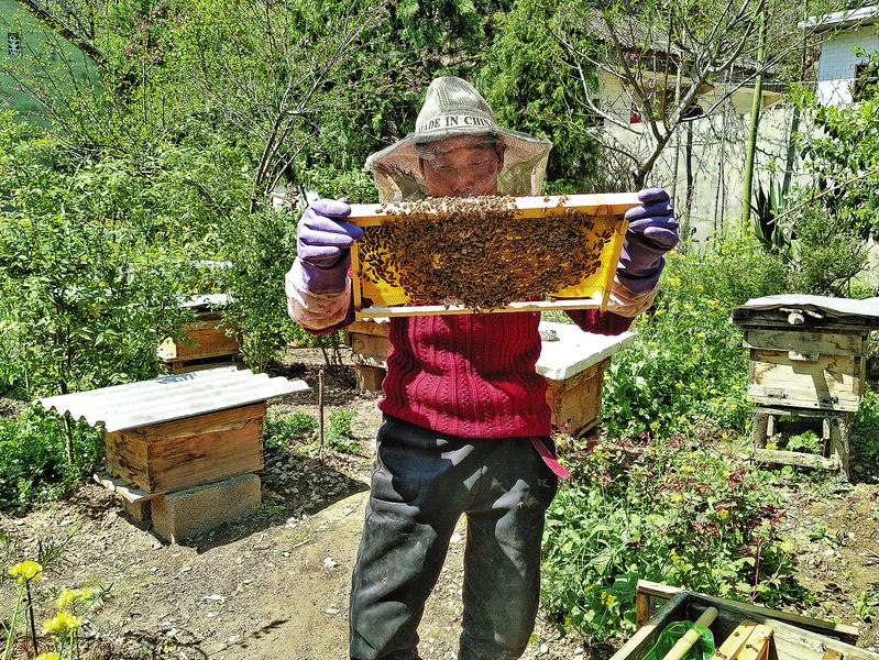 4月12日,洛南縣靈口鎮(zhèn)曹窯村十八坪組群眾王銀勞正在查看蜂巢。據(jù)了解,王銀勞是曹窯村建檔立卡貧困戶,2017年開始養(yǎng)殖中華蜂,從最初的4箱發(fā)展到目前的75箱,去年已實現(xiàn)穩(wěn)定脫貧,預(yù)計今年養(yǎng)蜂可實現(xiàn)收入1.5萬元。(劉衛(wèi)鋒 攝)