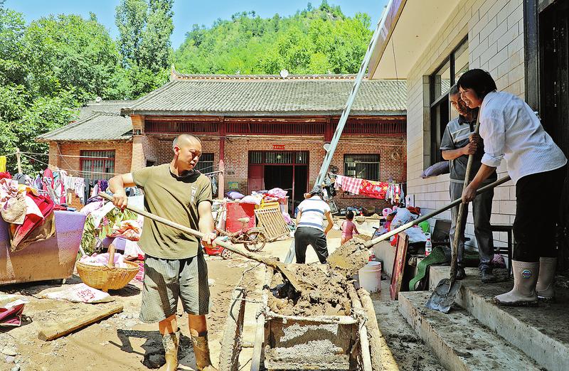 受災(zāi)群眾清理門前和室內(nèi)淤泥