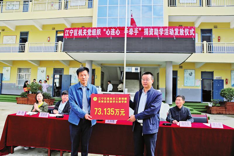 當(dāng)天,南京市江寧區(qū)機關(guān)工委書記夏巍巍帶領(lǐng)其他3名干部代表江寧區(qū)為洛南縣捐贈助學(xué)金73.135萬元,并現(xiàn)場為5名學(xué)生代表每人發(fā)放助學(xué)金1000元。據(jù)了解,在江寧區(qū)機關(guān)工委的支持與幫助下,2018年至今,江寧區(qū)已累計為洛南縣投入捐資助學(xué)資金220.13萬元,累計資助貧困家庭學(xué)生2504名,有效解決了全縣貧困戶子女“上學(xué)難”問題,為洛南縣順利打贏教育扶貧攻堅戰(zhàn)奠定了堅實基礎(chǔ)。