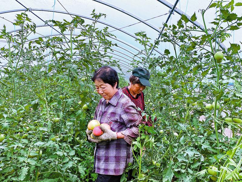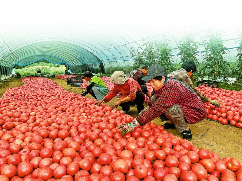 8月18日,筆者走進洛南縣古城鎮(zhèn)中聯(lián)村集體經(jīng)濟蔬菜大棚,只見鮮紅欲滴的西紅柿掛滿了枝頭,在綠葉的映襯下顯得格外嬌艷奪目,大棚內散發(fā)著誘人的果蔬香甜。進棚務工的村民正在采摘西紅柿,等待裝箱的西紅柿像紅色的地毯一樣鋪滿地面,一派豐收喜人的景象。
