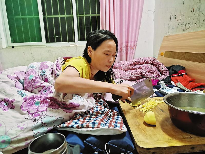 “像蟲(chóng)一樣向前挪動(dòng)著身體。”齊敏蟬說(shuō)。她每天艱難地在床上做康復(fù)訓(xùn)練,鍛煉胳膊和上身的力量,漸漸地,她可以隔兩個(gè)小時(shí)自己翻一次身;拿筷子時(shí)手不抖了,胳膊也有勁了,能自己吃飯了。丈夫忙的時(shí)候,給她把東西準(zhǔn)備好,在床邊支個(gè)小桌子,她爬在床上切菜、做飯。最大的變化是,齊敏蟬不再那么怕別人異樣的目光,丈夫推她出去曬太陽(yáng),也能和左鄰右舍聊天了。