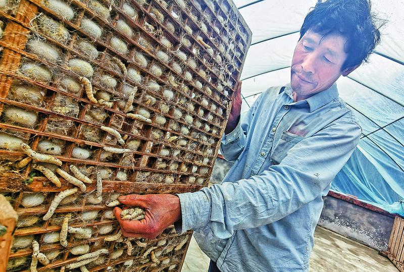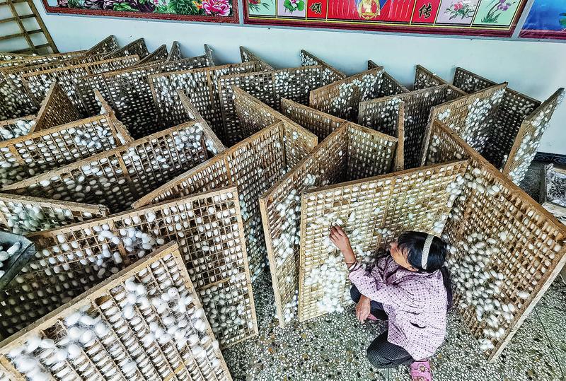 村民吳鳳霞在自家院子里縫補蠶盤,她一邊熟練地縫補一邊笑著說:“今年一茬養(yǎng)了80多盤蠶,能收160斤左右的蠶繭。我家養(yǎng)蠶有10多年了,不出門在家養(yǎng)蠶,對于我們留守在村里的人來說,受點苦在家就能掙錢,也算是一個好營生。”在吳鳳霞家的客廳,整齊地擺滿了已經完成結繭的蠶盤。手工打造的紅柜和墻上嶄新的年畫,映襯出這家人的紅火日子。