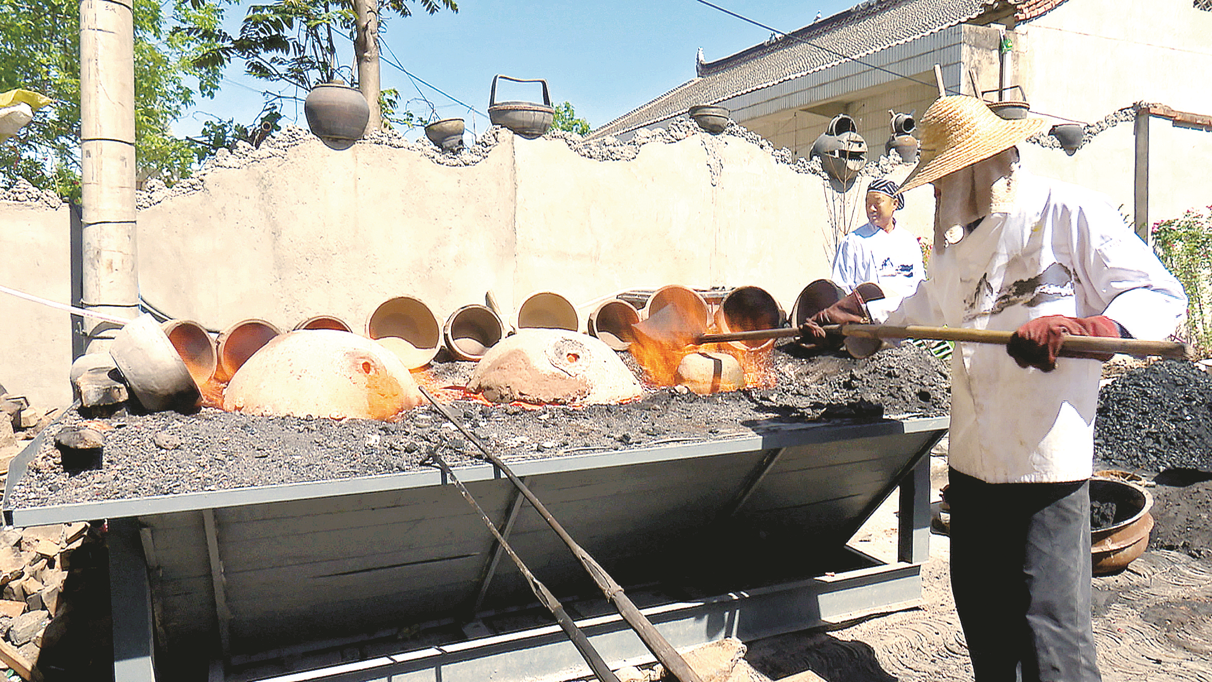 八里砂鍋傳人尤鐵娃對(duì)制作好的砂鍋進(jìn)行燒制