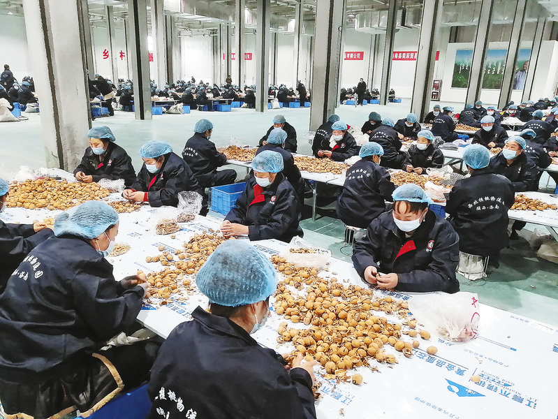 近年來,洛南縣把核桃產(chǎn)業(yè)作為縣域經(jīng)濟發(fā)展的主導(dǎo)產(chǎn)業(yè),按照“市場+企業(yè)+合作社+基地+農(nóng)戶”的發(fā)展模式,不斷推動核桃產(chǎn)業(yè)高質(zhì)量發(fā)展,規(guī)劃建設(shè)了西北地區(qū)功能最完善、現(xiàn)代化程度最高、規(guī)模設(shè)施最大的西北核桃物流園區(qū),該園區(qū)的建成將解決千余名群眾就業(yè),人均年增收2.4萬元。圖為工人正在分揀核桃仁。 (本報通訊員 閆偉鋒 攝)