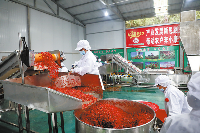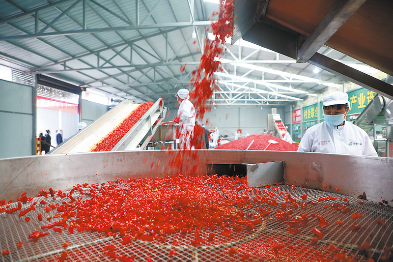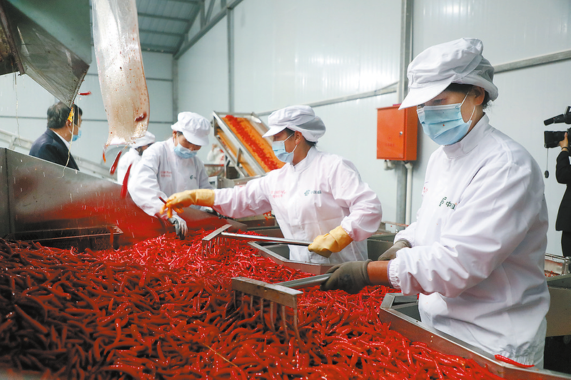 位于洛南縣景村鎮(zhèn)的辣椒加工廠內(nèi),紅彤彤的辣椒堆成了小山,新鮮的辣椒通過分揀、篩選后運(yùn)到工廠,經(jīng)過上料、風(fēng)選、清洗、切斷、過篩、稱重、攪拌之后,就變成了鮮紅的辣椒醬。