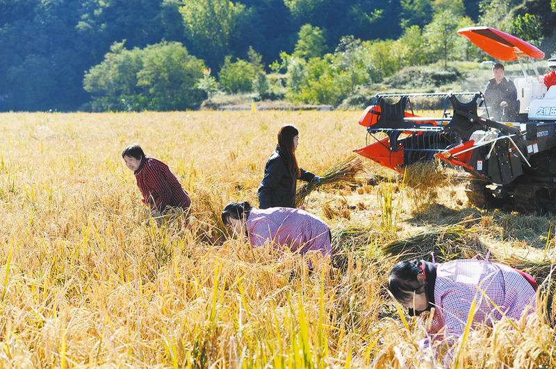 “春種一粒粟,秋收萬顆子”。進入10月下旬,隨著金黃的稻田進入豐收季,洛南縣保安鎮(zhèn)眉底村蘇陜協(xié)作水稻新品種試種基地的150畝稻田成了炙手可熱的網(wǎng)紅打卡地。來自商洛、西安和河南南陽等地的游客紛紛前來這里拍照參觀。小山村的稻田之所以走紅,除了稻田形成的風景之外,許多人其實都是想一睹“南稻北種”的神奇效果。