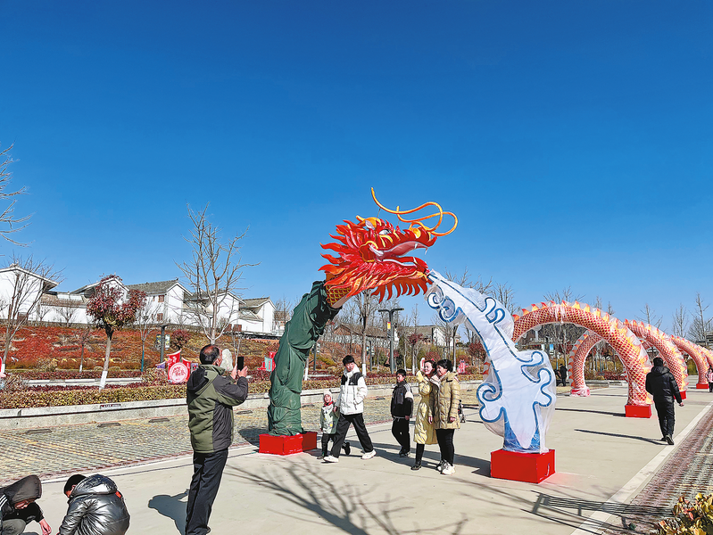 春節(jié)將至,洛南縣音樂小鎮(zhèn)掛起火紅的燈籠、架起吉祥的“龍門”,將景區(qū)裝扮一新,喜慶熱鬧的新年氛圍撲面而來。圖為1月27日,游客在“龍門”前拍照打卡。 (本報記者 孫常飛 攝)...