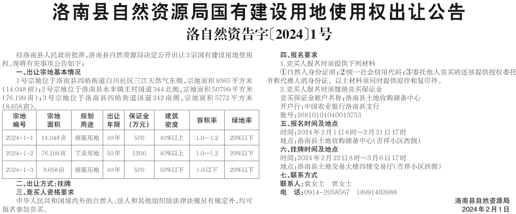 洛南縣自然資源局國有建設用地使用權出讓公告