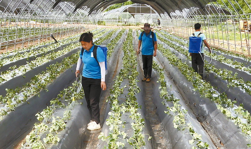 務(wù)工群眾正在給新移栽的草莓苗噴水