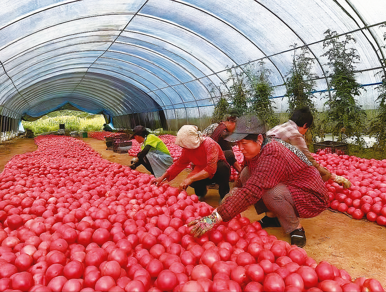 近期,洛南縣古城鎮(zhèn)中聯(lián)村寧農(nóng)瓜果蔬菜產(chǎn)業(yè)示范園大棚里的西紅柿迎來(lái)了豐產(chǎn)季。10月18日,示范園內(nèi)10多個(gè)村民正在忙碌地采摘、運(yùn)送、分揀成熟的西紅柿,大棚里一派豐收的景象。