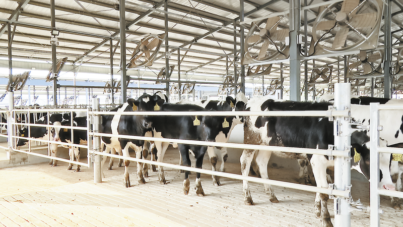 新引進(jìn)的奶牛在配備有自動牛體刷等設(shè)施的牛舍內(nèi)悠閑地活動