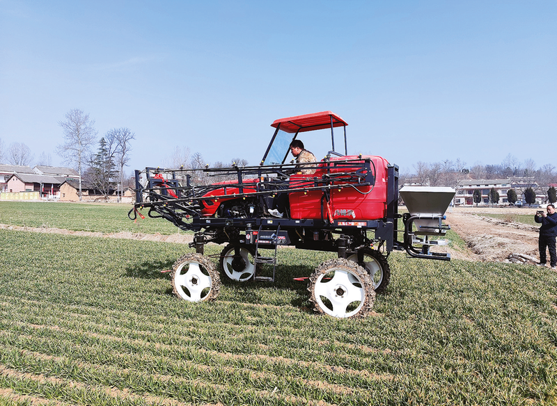 2月28日,在古城鎮(zhèn)何村連片麥田里,一臺自走式噴桿噴霧機正在作業(yè)。