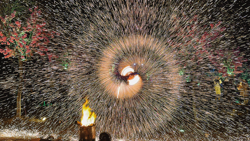 穿插在打鐵花間隙的“風火輪”表演火光旋舞,光帶成環(huán),現(xiàn)場更添熱烈。