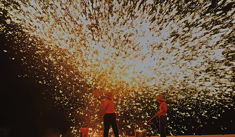 鐵花如金雨迸散,瞬間點亮夜空。