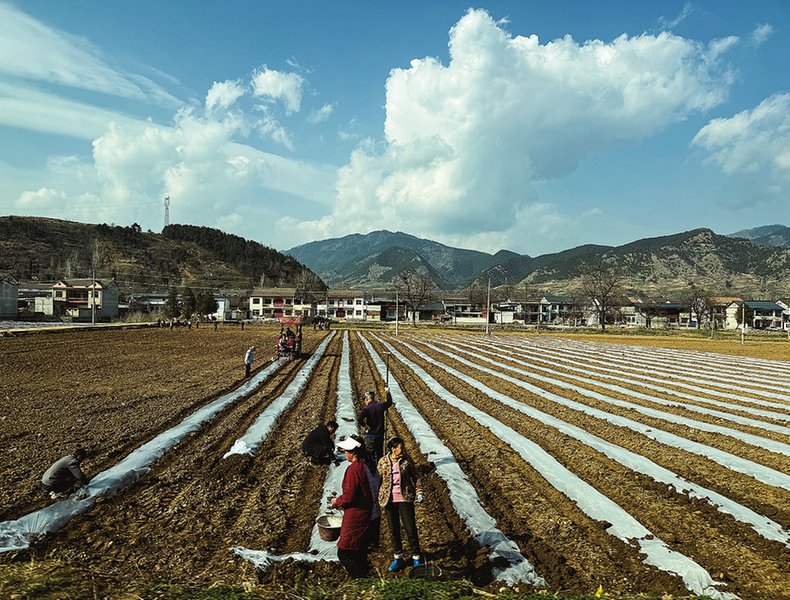 在洛南縣保安鎮(zhèn)許廟村,群眾搶抓農(nóng)時(shí)鋪設(shè)地膜,田間一派繁 忙景象。
