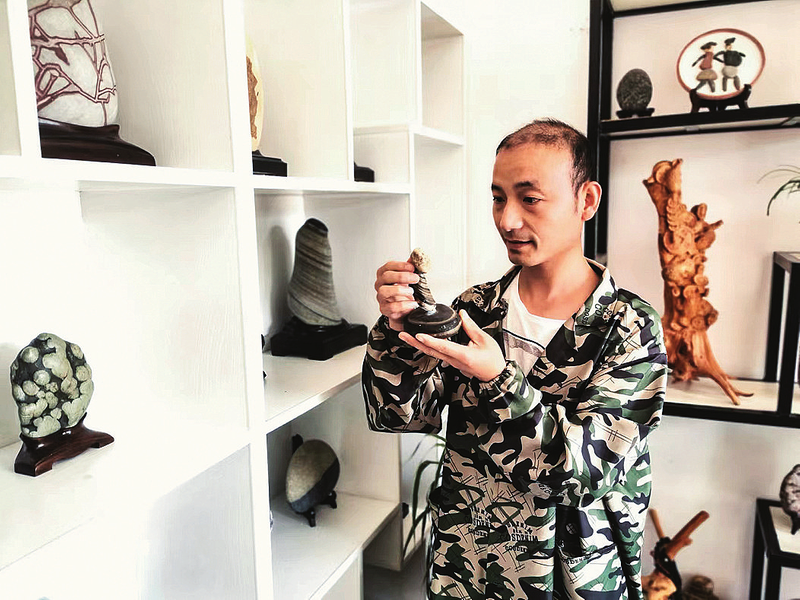 宋偉的房前屋后也成了“奇石收藏館”,室內(nèi)陳列著大大小小、形態(tài)各異的石頭,黃蠟石、蛤蟆豆、長(zhǎng)江紅碧玉、文字石、圖案石等擺件應(yīng)有盡有,琳瑯滿目,讓人眼花繚亂。因?yàn)樗蝹釔?ài)收集純天然石頭,并鉆研石頭手工藝制作,既成就了自己也幫助了別人。在宋偉的幫助下,許多本地、外地愛(ài)好者通過(guò)抖音短視頻聯(lián)系上他。從2017年到現(xiàn)在,先后10多人向宋偉拜師學(xué)藝,也都紛紛靠著石頭走上了發(fā)家致富的道路。