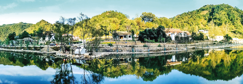 遠(yuǎn)山如黛,近水似玉。如鏡水面上,倒映著綠樹青瓦白墻以及那淡淡的落日余暉。一葉扁舟劃破水面的寧?kù)o,歡聲笑語(yǔ)回蕩在綠水青山間。