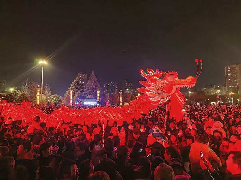 ?2月10日晚,群眾在商南縣文化廣場舉行舞龍表演。