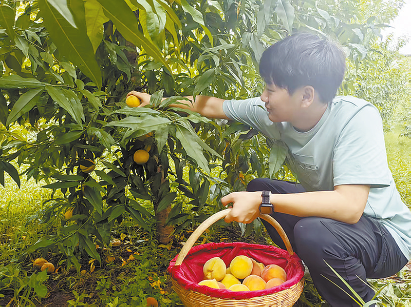 游客在果園里摘桃