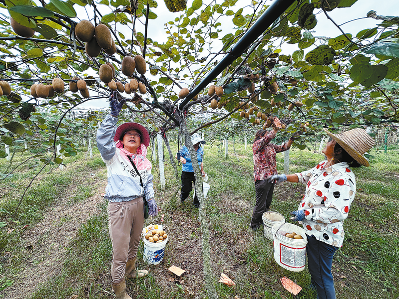 9月15日,在商南縣富水鎮(zhèn)王家莊村的種植基地里,工人正在采摘獼猴桃。該基地栽種有徐香、金桃、金艷、G3等多個(gè)品種的獼猴桃210畝,目前已經(jīng)進(jìn)入豐產(chǎn)期。預(yù)計(jì)今年產(chǎn)量可達(dá)到100噸,年產(chǎn)值80萬(wàn)元,直接帶動(dòng)周邊群眾穩(wěn)定增收。 (本報(bào)記者 胡 蝶 攝)