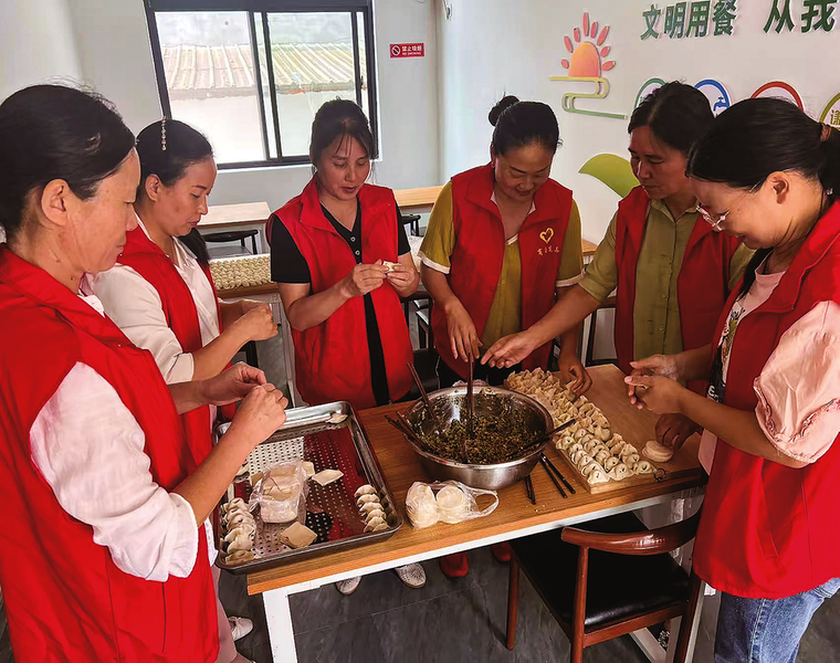 △社區(qū)志愿者在“愛心食堂”為社區(qū)居民包餃子。