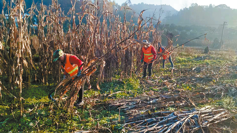 志愿者幫忙清理田間的玉米秸稈
