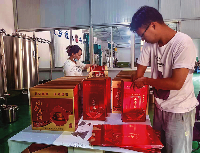 源味油坊里工人正在包裝香油