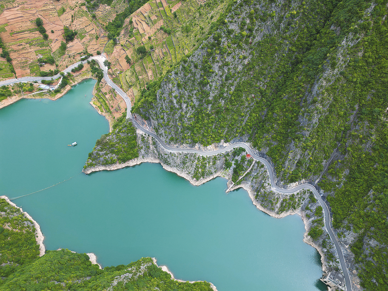 5月25日,記者驅(qū)車前往這條掛壁公路一探究竟。從水陽高速戶家塬立交駛出后,沿著345國道向戶家塬鎮(zhèn)方向行駛,在下南灣和黨家塬交界處駛?cè)霊衾渎?,朝康家?guī)X方向行駛,嶄新的柏油路逐漸收窄,景色卻愈發(fā)迷人,這條險峻的掛壁公路逐漸揭開面紗。