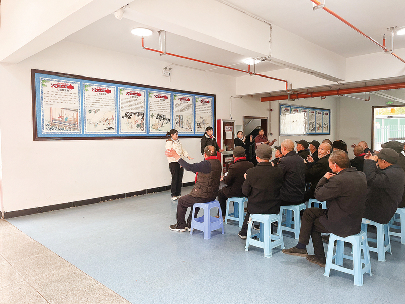 敬老院內(nèi)工作人員帶領(lǐng)老人活動(dòng)筋骨