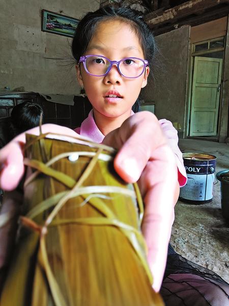 小孫女“顯擺”自己包的粽子