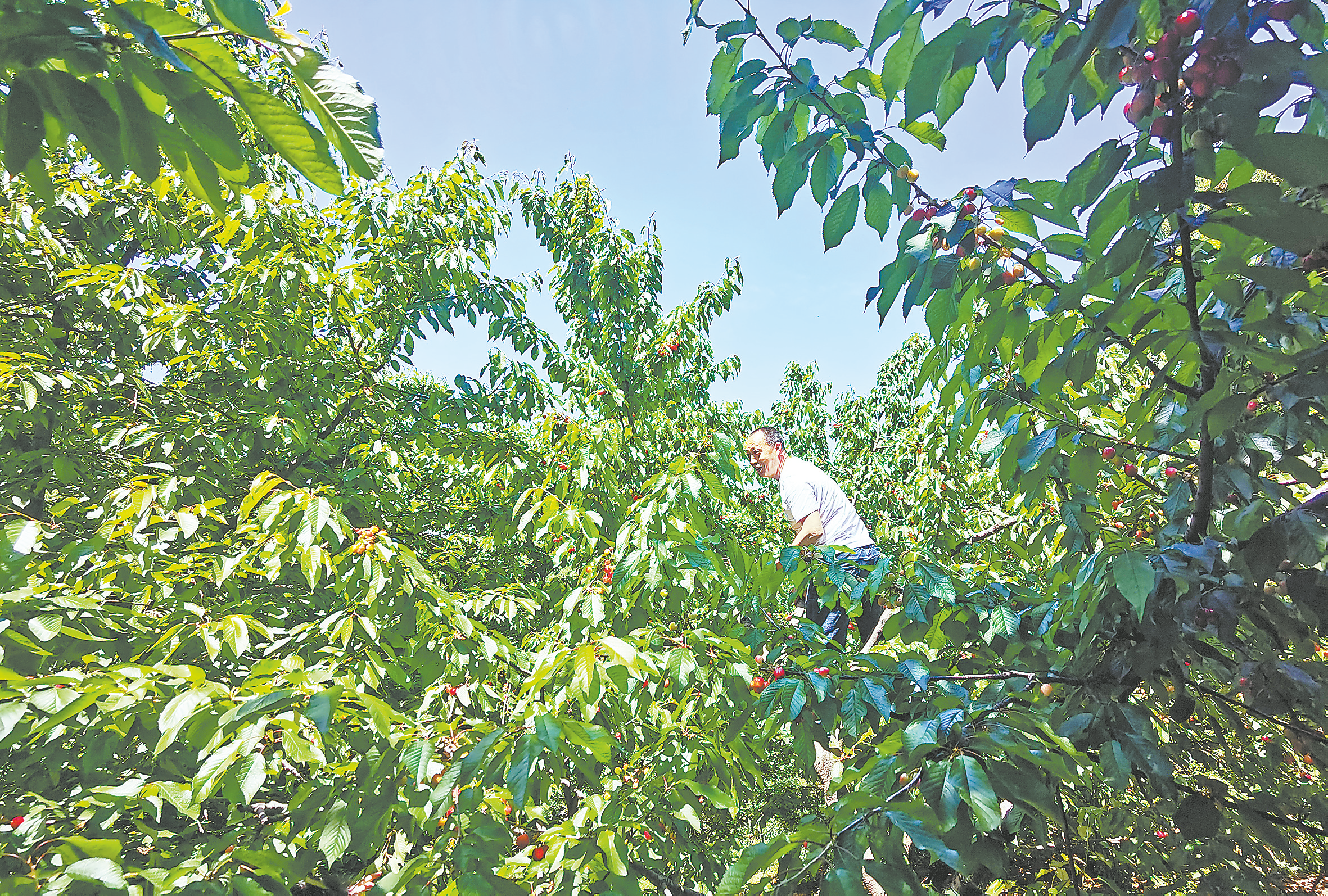 村民爬上櫻桃樹采摘櫻桃