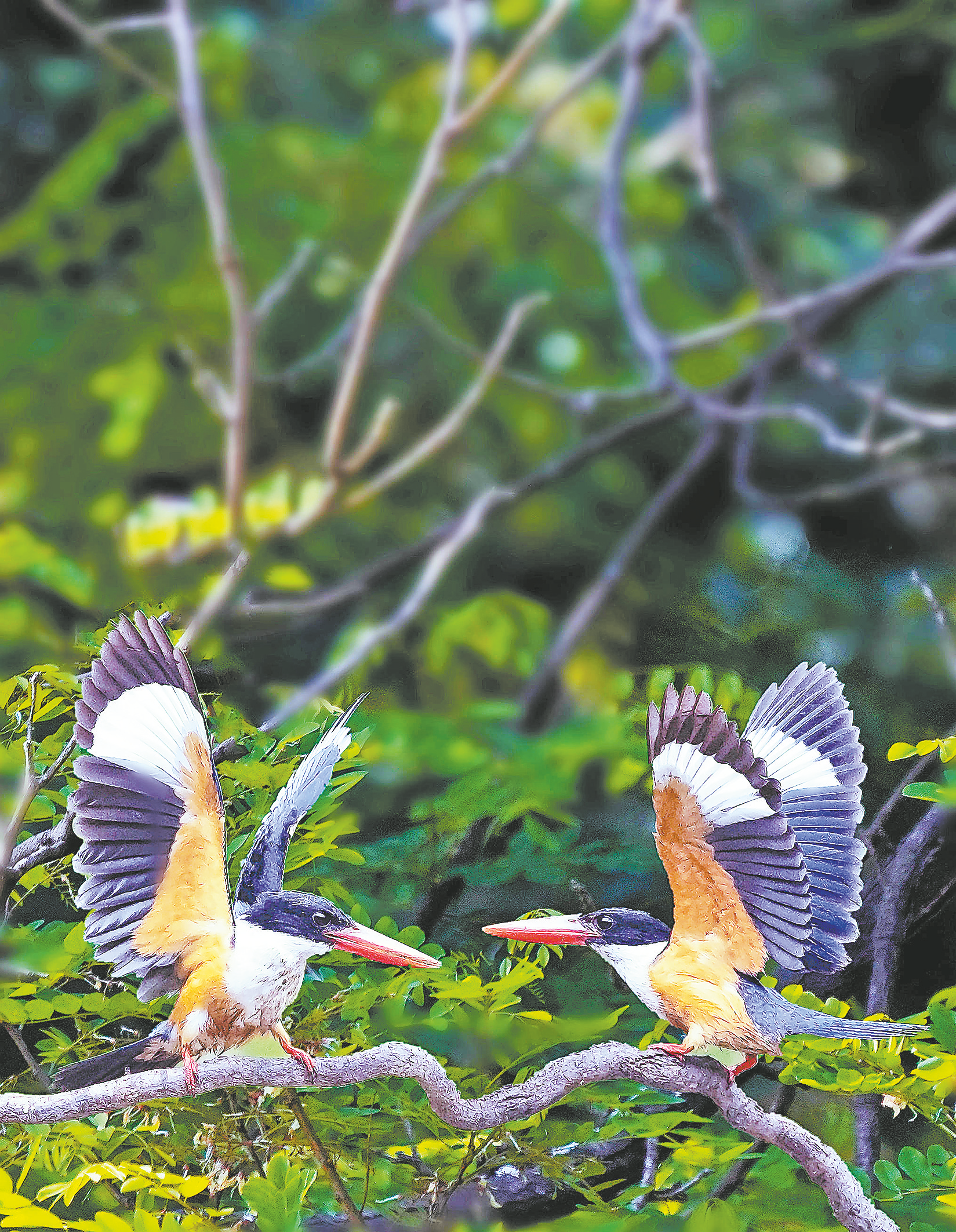 5月17日,筆者攜帶裝備,騎上摩托車趕往商州硯川河流域大荊方向,在河邊的草叢中,相繼抓拍到兩種奇特的鳥類。回家后,經過核查對比,發(fā)現拍攝的這兩類鳥在商州很少見,一種是我國的特有物種——臺灣紫嘯鶇,其胸、腹和翼的覆羽有藍色光澤,其余體羽均為紫藍色;另一種是“藍寶石”——翡翠鳥,其上體羽是藍色有光澤,下體羽是橙棕色,胸下是栗棕色,翅翼是黑褐色,足短小,腳是珊瑚紅色,尾巴很短,但飛起來很靈活。