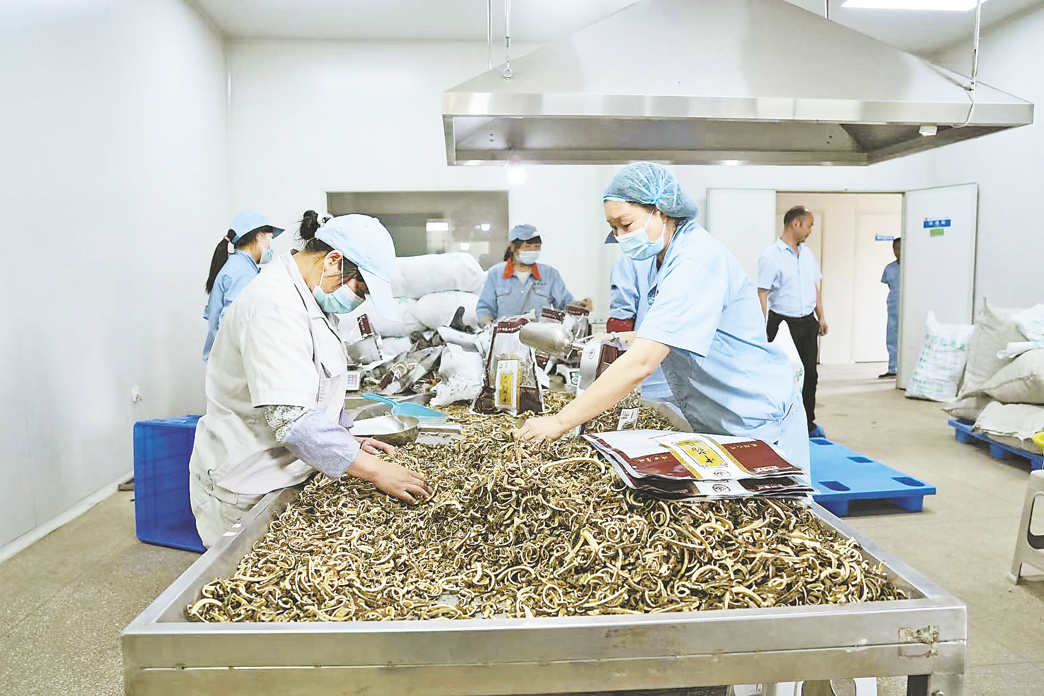 在陜西康城藥業(yè)股份有限公司生產(chǎn)車間內(nèi),工人正在加工中藥材。