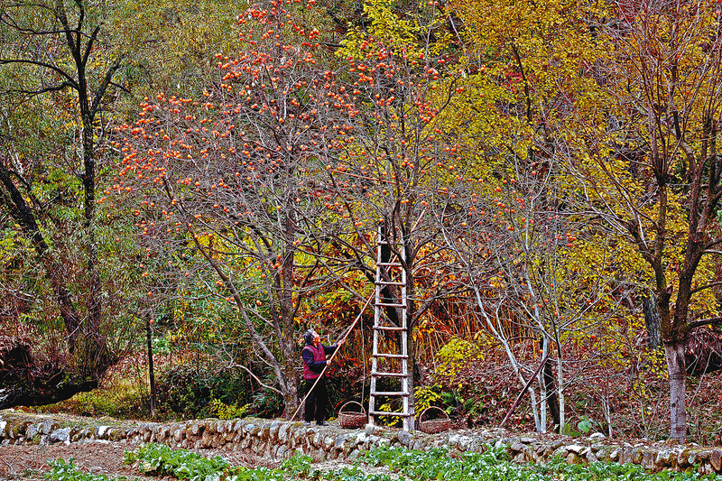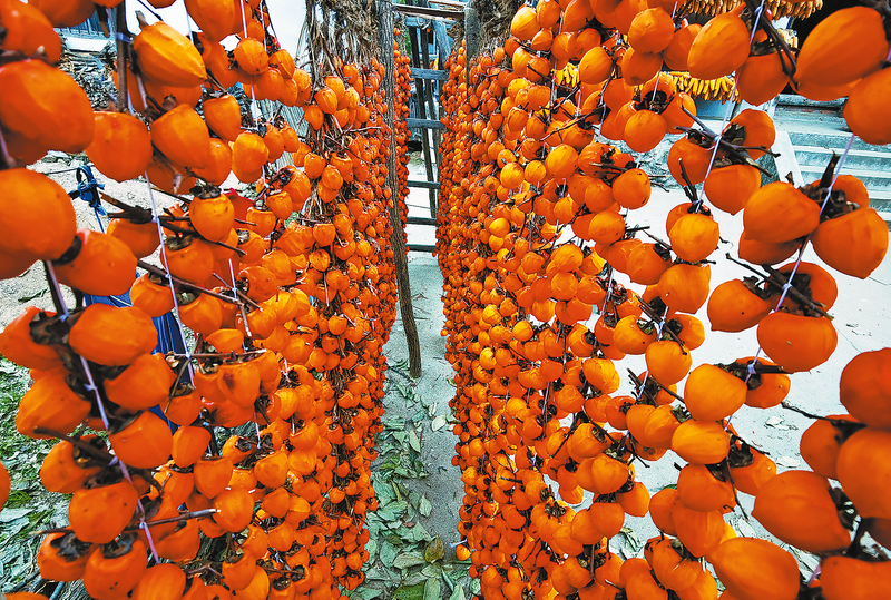 這些被村民高高掛起來進行晾曬的柿子,每個都已經(jīng)被去了皮,將被制作成柿餅。去皮就是用傳統(tǒng)的手工去皮刀,將七八成熟的柿子表面削除。據(jù)村民介紹,柿子光滑的表皮具有一定的澀味,削除表層后通過晾曬、上霜,柿子更加甘甜可口、有韌性。