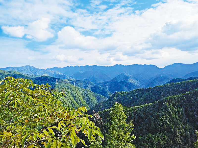 沿著“之”字形的土路爬上半坡,沿途葛藤鋪滿山坡,像一塊塊綠毯子。眺望遠(yuǎn)方的流嶺山脈,那個尖尖的山峰就是天寶寨。俯瞰腳下,重巒疊嶂,滿目蒼翠,河谷屋舍儼然。天空藍(lán)得醉人,空氣清新,令人心曠神怡。