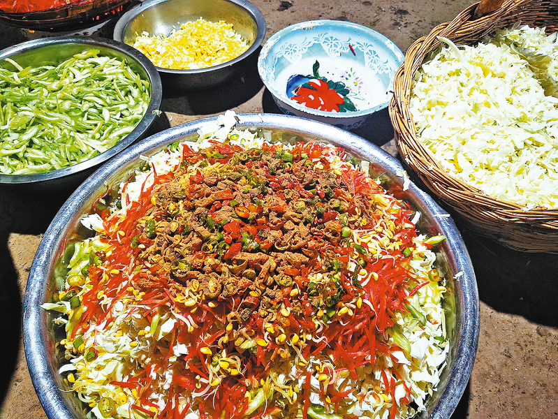 李鎖盈介紹,村里家家戶(hù)戶(hù)腌菜的用料各不相同,他家的腌菜以蓮花白為主,配以黃豆芽焯水、大蒜切片、紅蘿卜擦絲、辣椒切小段、生姜切末、芹菜切片,然后用食用鹽和十三香調(diào)味攪拌,再壓進(jìn)大菜缸等待7天左右的時(shí)間自然發(fā)酵,就成了冬天到來(lái)年春天不可缺少的腌菜。
