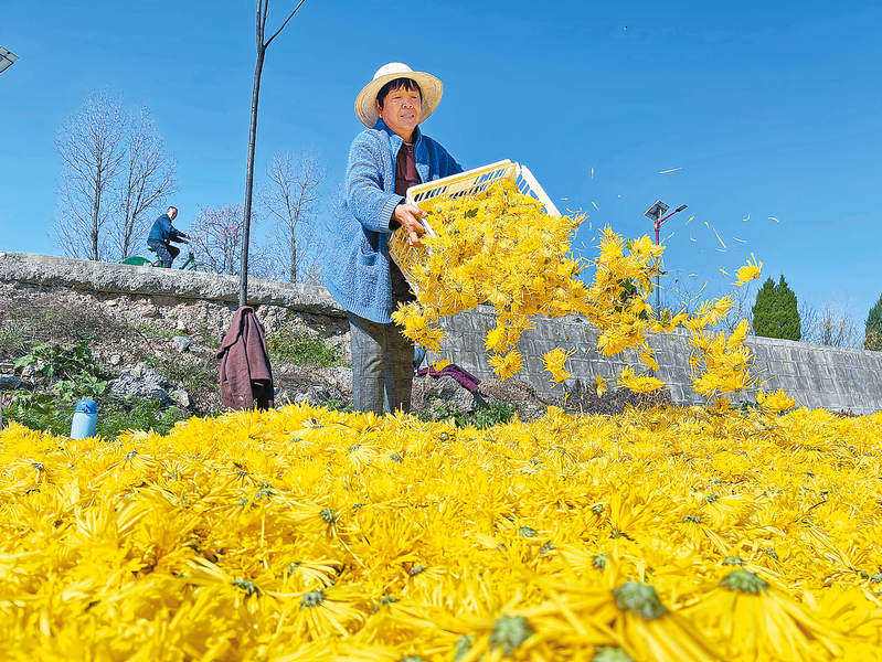 村民晾曬菊花