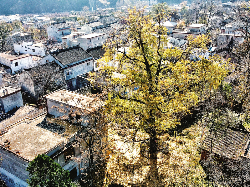 沿路的山坡上樹葉逐漸從綠泛黃,給漸冷的冬天平添了一份暖意。過河入村,遠(yuǎn)遠(yuǎn)地就能看到村莊深處有一片金黃的樹梢在陽光下閃閃發(fā)光,這就是記者此次前來特意尋找的千年古銀杏樹了。