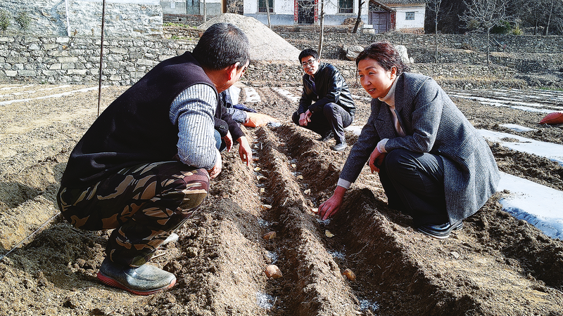在牧護(hù)關(guān)鎮(zhèn)秦嶺鋪村,農(nóng)業(yè)技術(shù)人員向村民傳授馬鈴薯播種與覆膜的技術(shù)。