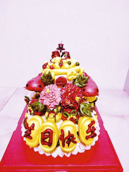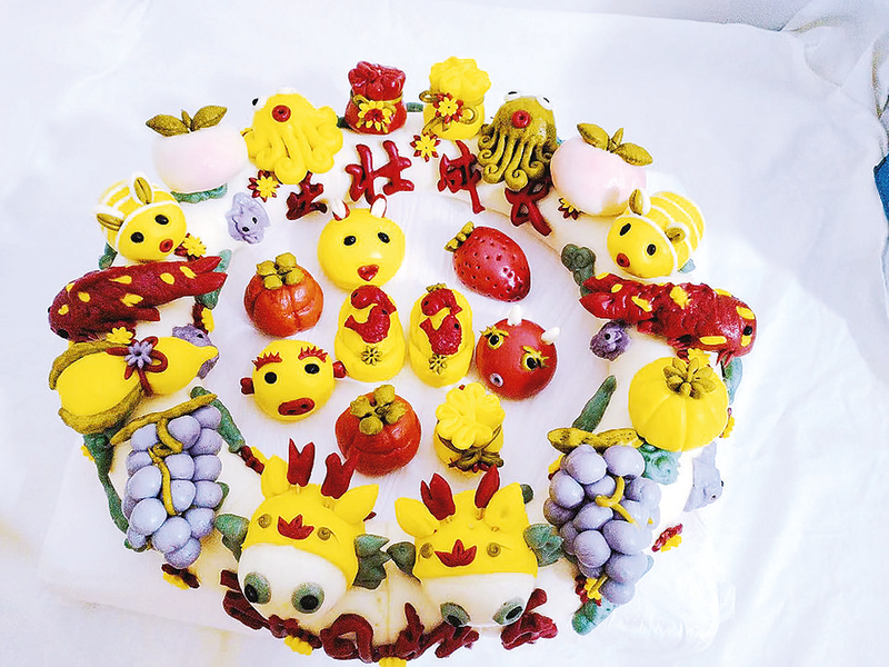 在花饃的造型上,除了傳統(tǒng)的龍、鳳、虎、花、鳥、魚、蟲等,鳳秀芳還結(jié)合網(wǎng)上流行的式樣,不斷推陳出新,讓人眼前一亮?!氨热缯f為老人過壽做的花饃,我一般會(huì)像做蛋糕一樣做二三層,福袋代表有福,石榴是百子百孫,還有桃子,寓意健康長(zhǎng)壽,這些元素都是手捏出來的?!兵P秀芳說,她還在網(wǎng)上買來印字的模具,最后在花饃上鑲嵌“生日快樂”“平安喜樂”“百年好合”一類的祝福語,起到了畫龍點(diǎn)睛的作用。