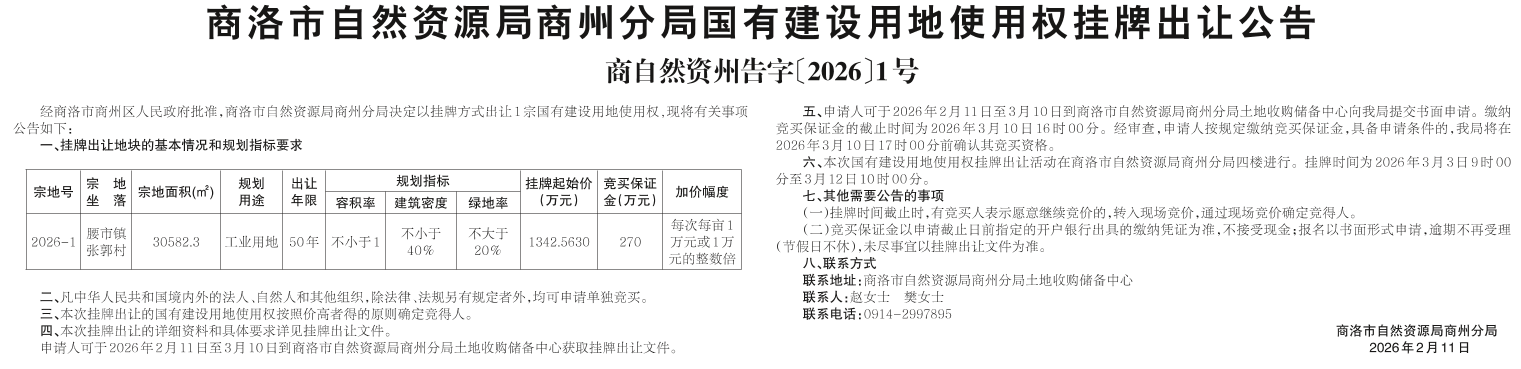 商洛市自然資源局商州分局國(guó)有建設(shè)用地使用權(quán)掛牌出讓公告