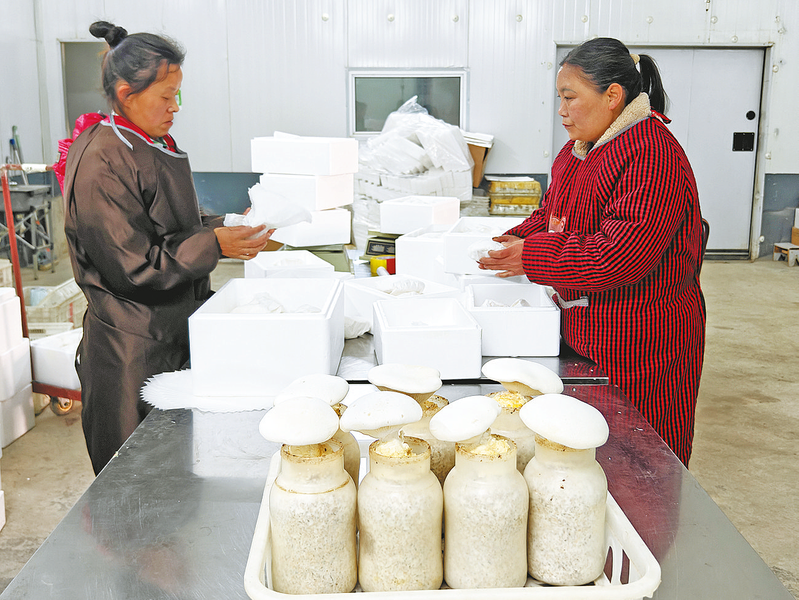 三月十一日,呂玲霞(右)和陳曉莉正在包裝車間里打包參加展銷的白靈菇。